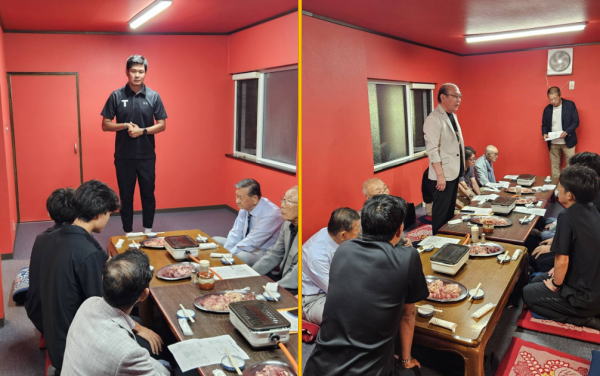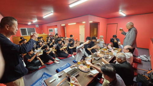 | 5年ぶりの箱根路復活へ「橙輪(だいりん)の花を咲かせろ」をチームスローガンに掲げ、治郎丸監督新体制で予選会突破へ向けて走力強化に取り組んでいる陸上競技部の紋別合宿に激励に伺いました。 激励会は、大館代表の歓迎挨拶で始まり、遊佐相談役をはじめ参加OBの自己紹介と激励でスタート。治郎丸監督からも箱根路復活に向けて力強い決意と激励会開催の謝意の挨拶をいただき、能登谷相談役の乾杯の音頭でスタート。 お店自慢のホルモンや焼き肉を堪能、学生諸君も合宿中間のきついコンディションにも関わらず予選会突破に向けて焼肉で英気を養い解散となりました。 治郎丸監督を囲んでの二次会も、参加OBより数多の激励と箱根路復活へ熱望の言葉が飛び交いました。この激励会が日々苦しい練習に耐え、自分たちの目標に向かって努力している陸上競技部皆様への力となればと願っております。 | ||||||||||||||||||||||||||||||||||||||||||||||||||||||||