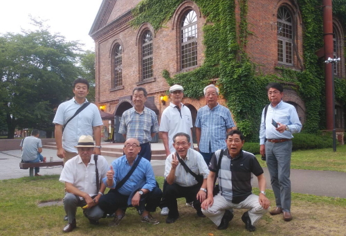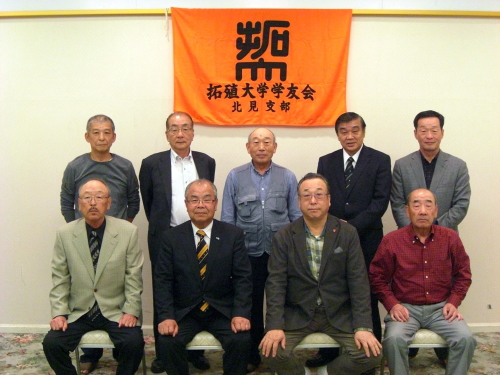 | ≪前列右から≫ 鈴木道明(学67・副支部長)、土門裕之(北短副学長)、 白戸義直(学60・顧問)、増子一男(学65・支部長)、 大館一生(学67・道連代表)、三好明彦(学62・道連顧問)、 森啓(学60・拓宗会長) ≪後列右から≫ 山本光良(学81・会計)、佐々木悟(学81)、塚本勝慶(学65)、 森本英俊(学73・事務局長)、椿原紀昭(学67・栗山町長) 遊佐啓二(学64・札幌支部)、松崎美津雄(学70・幹事長) |